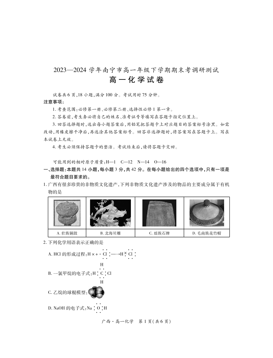 广西壮族自治区2023-2024学年南宁市高一年级下学期期末考试调研测试 化学