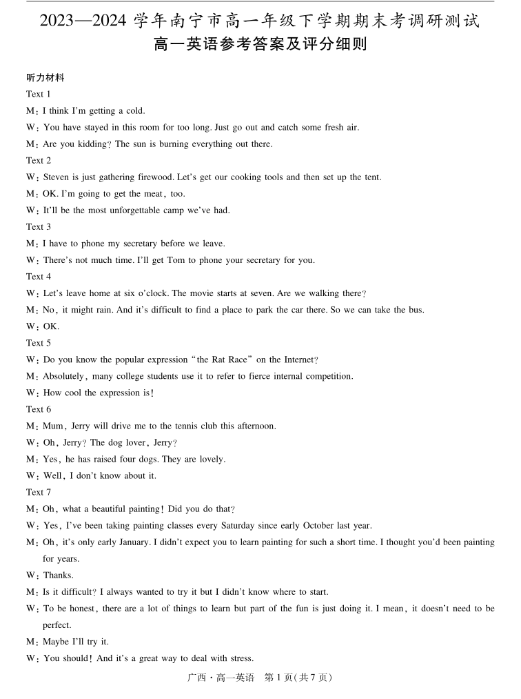 广西壮族自治区2023-2024学年南宁市高一年级下学期期末考试调研测试 英语答案