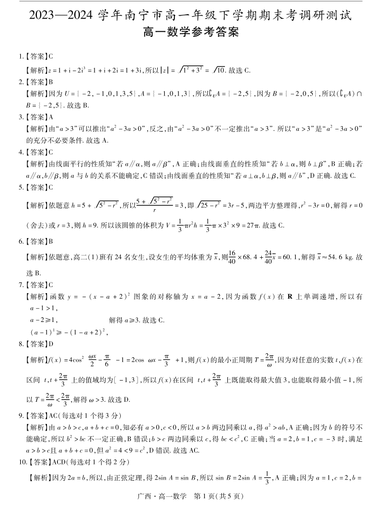 广西壮族自治区2023-2024学年南宁市高一年级下学期期末考试调研测试 数学答案