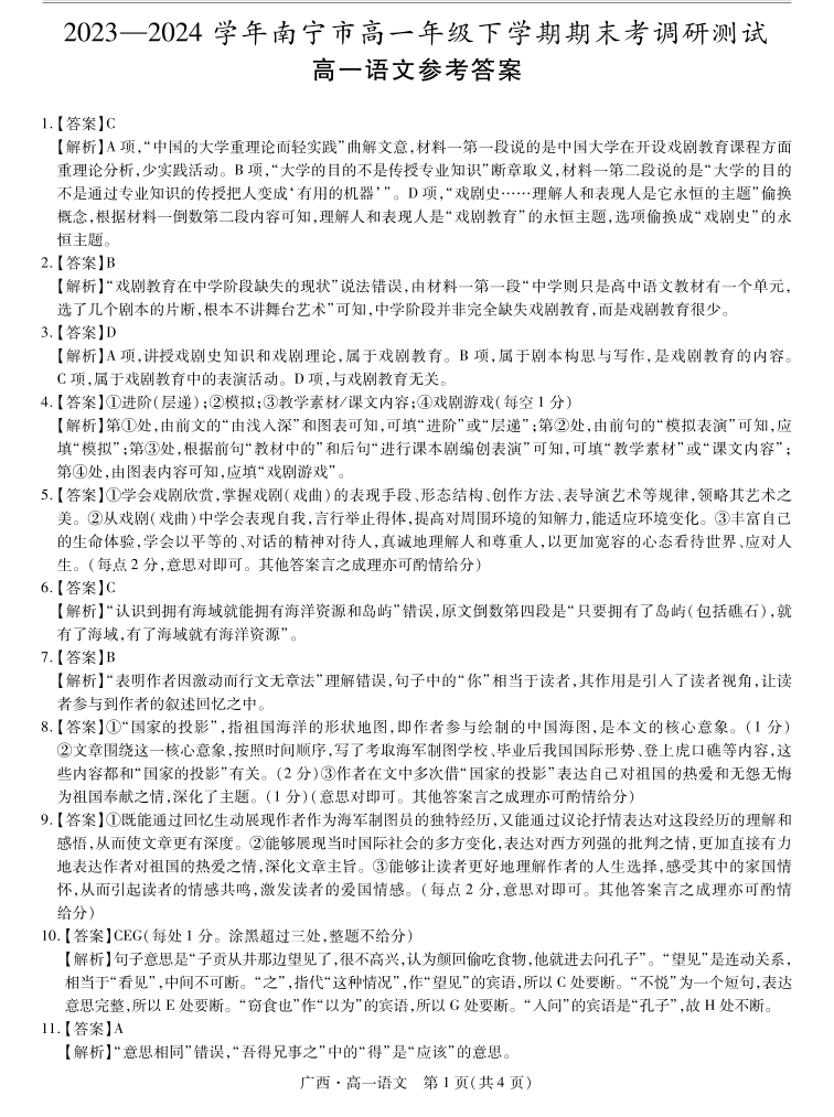 广西壮族自治区2023-2024学年南宁市高一年级下学期期末考试调研测试 语文答案