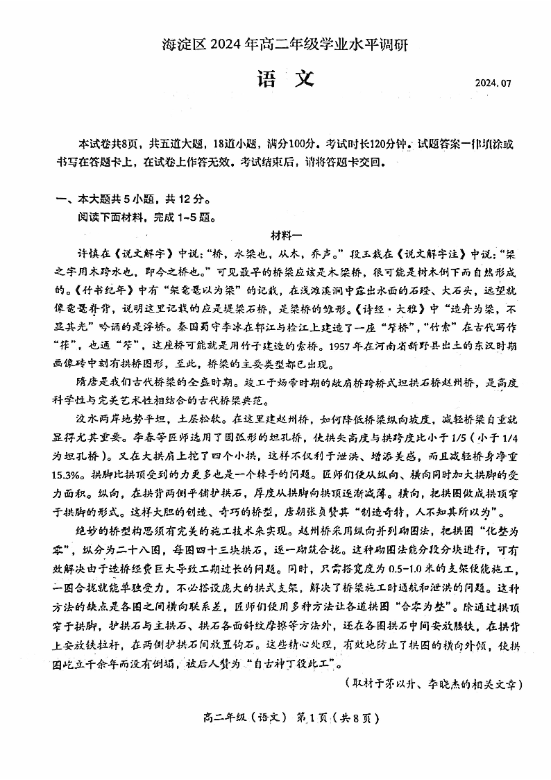 北京市海淀区2023-2024学年高二下学期7月期末学业水平调研考试 语文