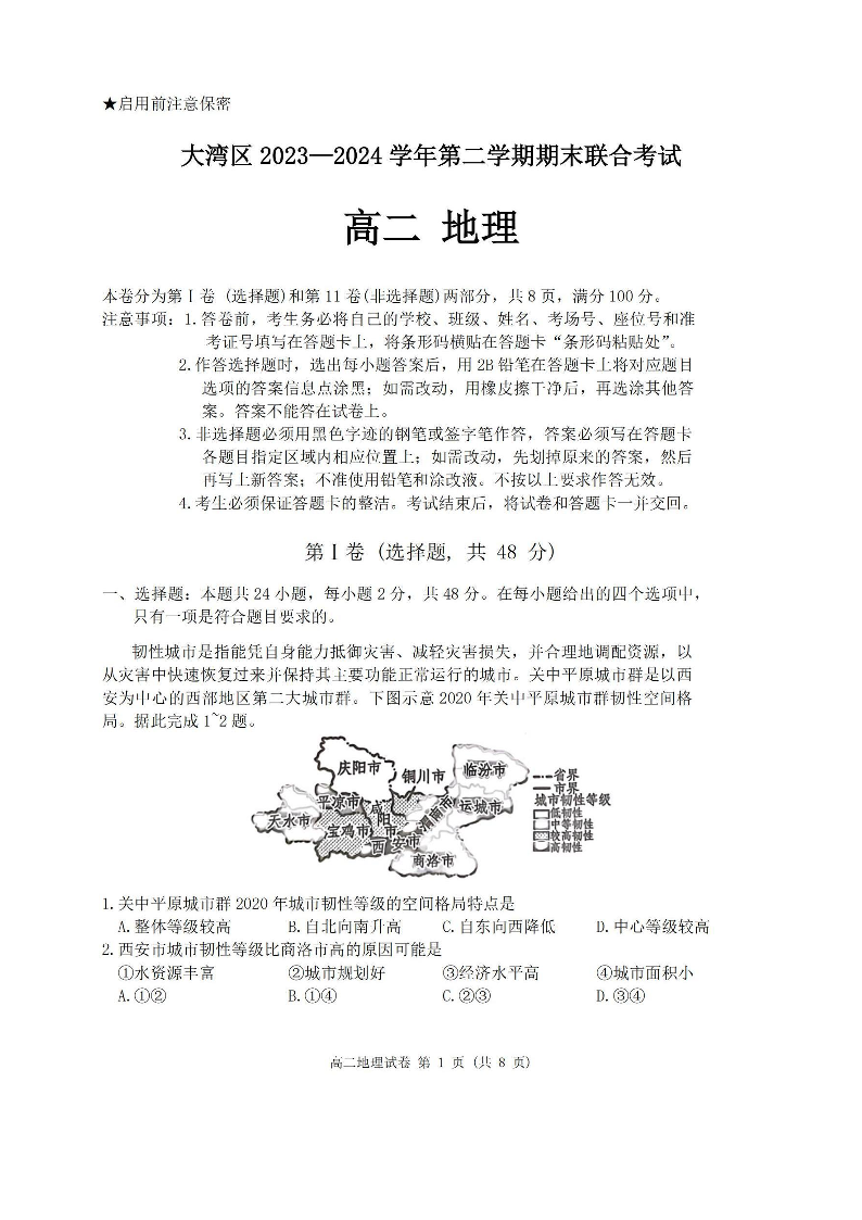 广东省大湾区2023-2024学年高二下学期期末联合考试暨珠海高二期末考试 地理