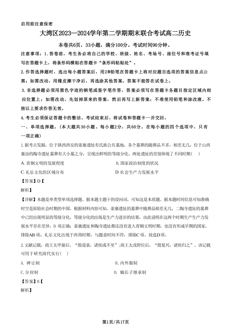 广东省大湾区2023-2024学年高二下学期期末联合考试暨珠海高二期末考试 历史