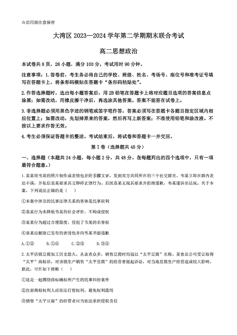 广东省大湾区2023-2024学年高二下学期期末联合考试暨珠海高二期末考试 政治