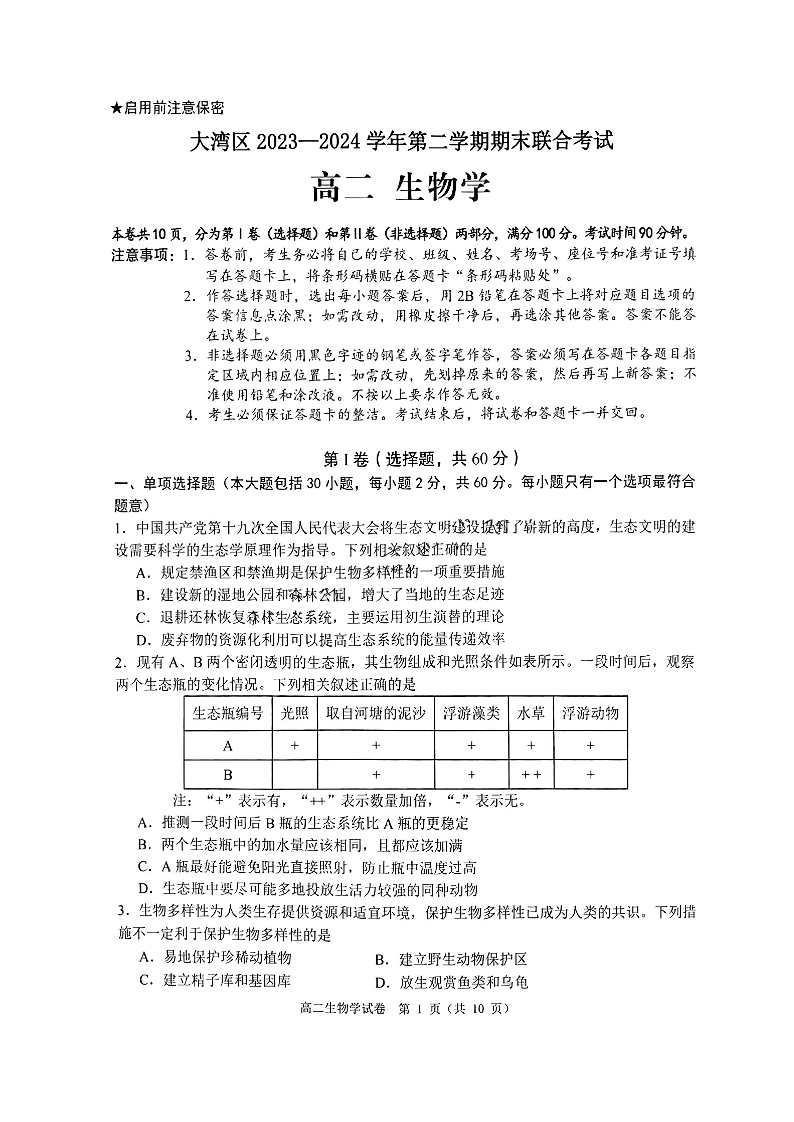 广东省大湾区2023-2024学年高二下学期期末联合考试暨珠海高二期末考试 生物