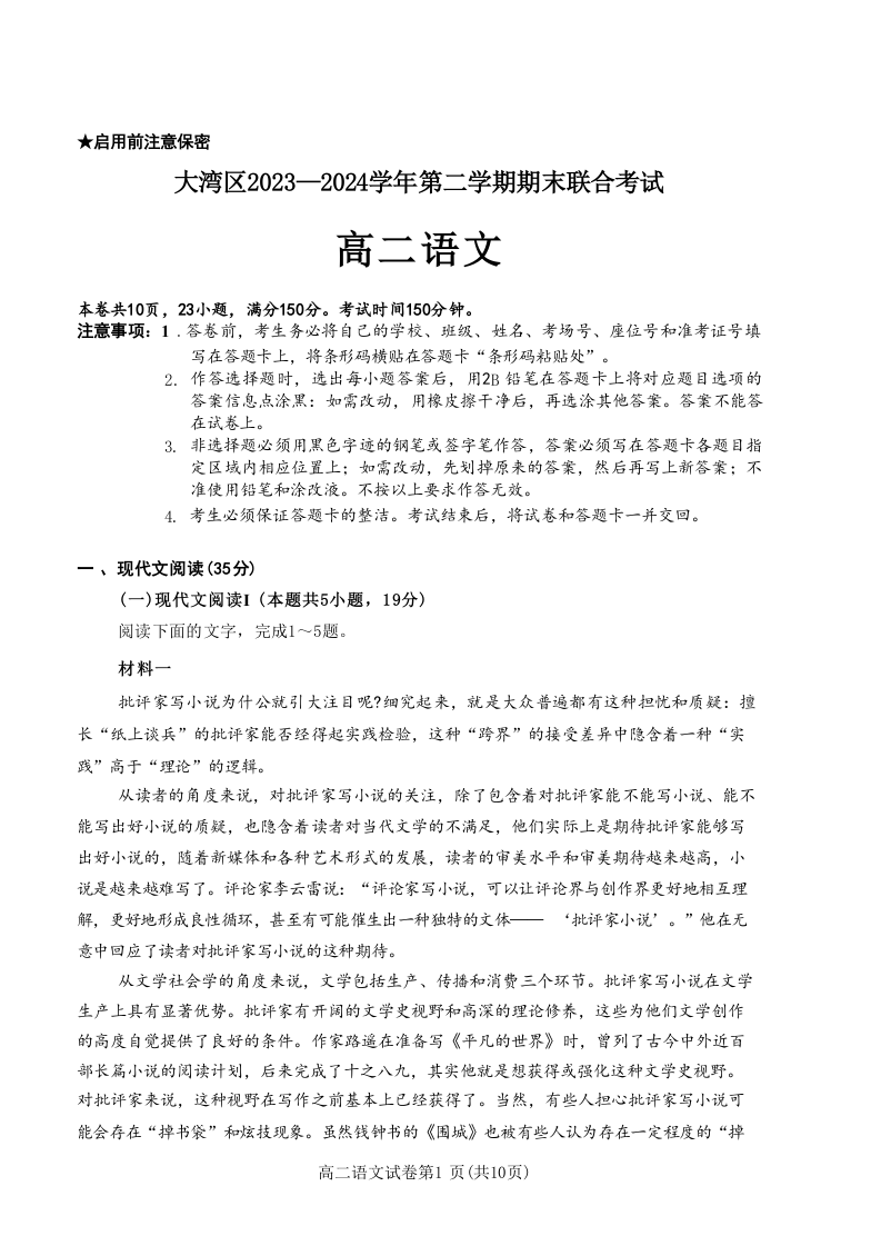 广东省大湾区2023-2024学年高二下学期期末联合考试暨珠海高二期末考试 语文