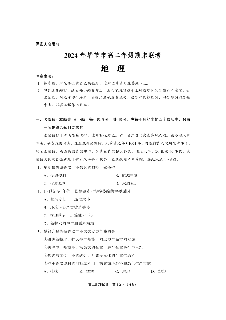 2024年毕节市高二年级期末联考 地理