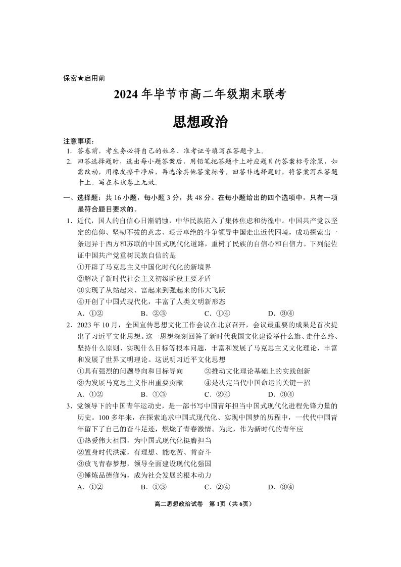2024年毕节市高二年级期末联考 政治