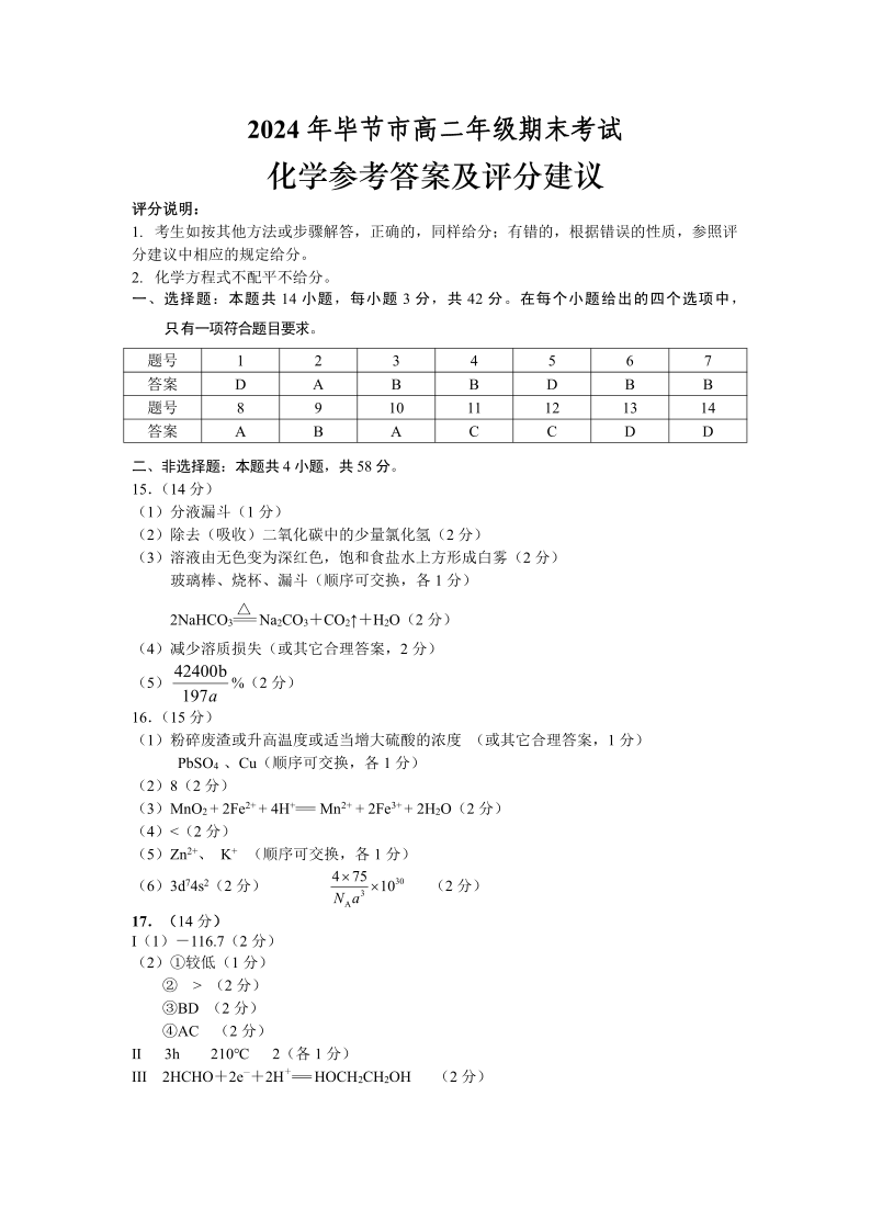 2024年毕节市高二年级期末联考 化学参考答案