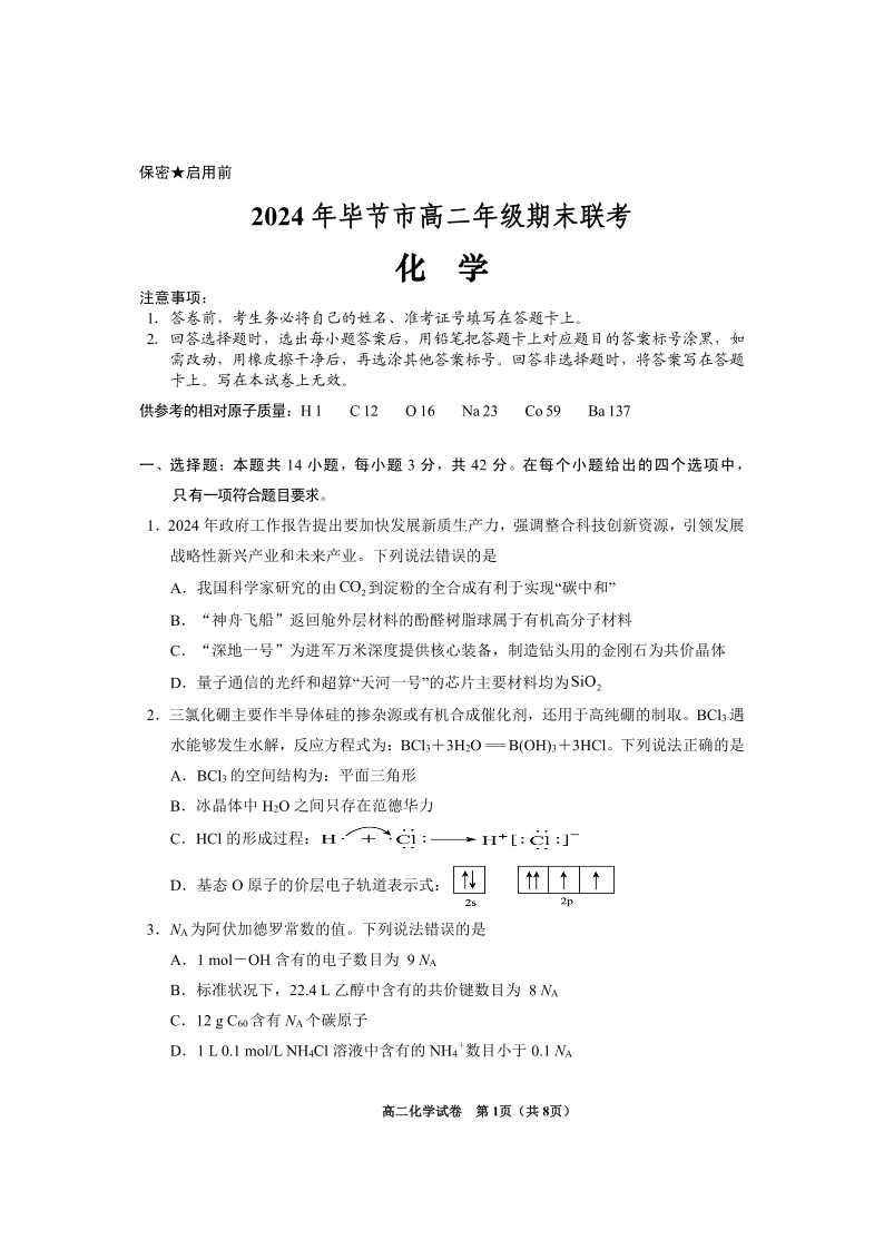 2024年毕节市高二年级期末联考 化学