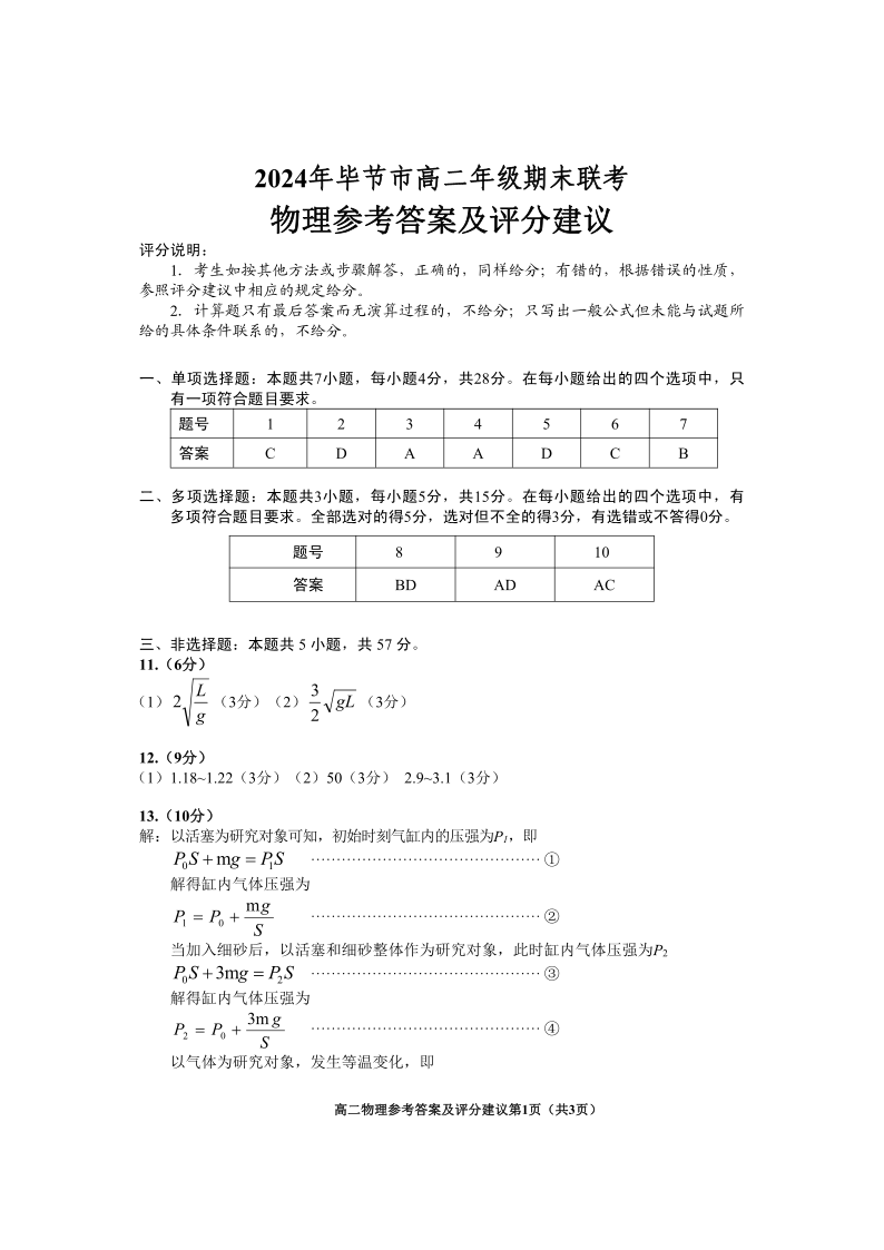 2024年毕节市高二年级期末联考 物理参考答案