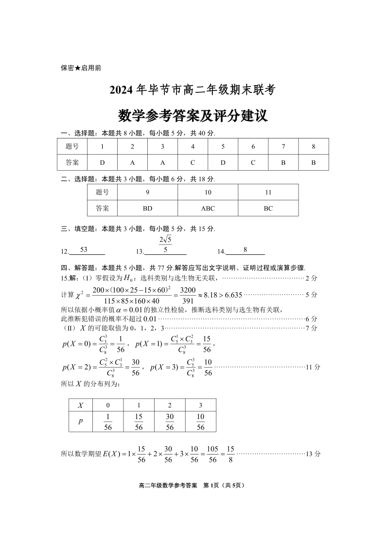 2024年毕节市高二年级期末联考 数学参考答案