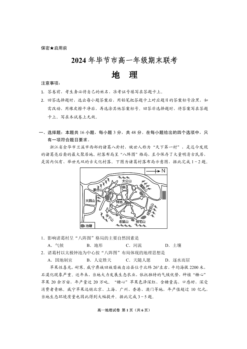 2024年毕节市高一年级期末联考 地理