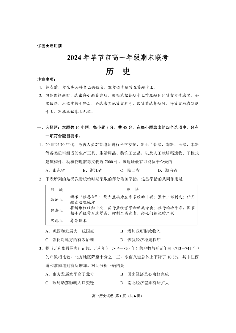 2024年毕节市高一年级期末联考 历史