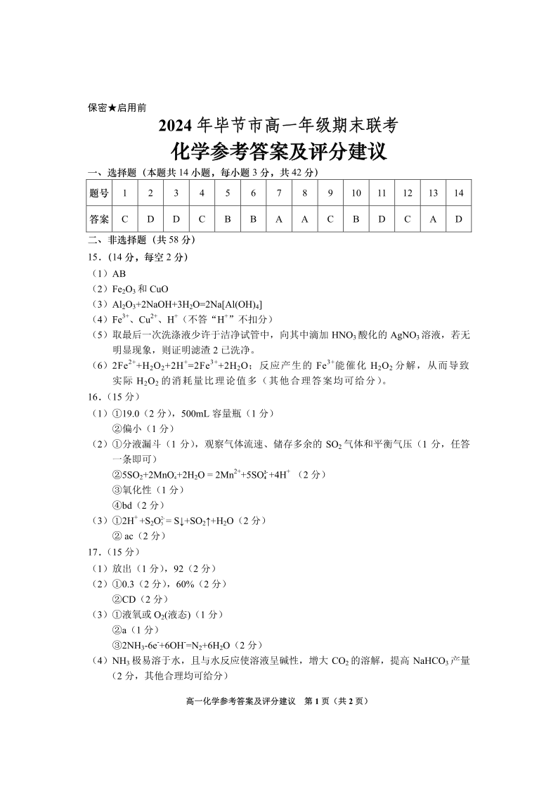 2024年毕节市高一年级期末联考 化学参考答案