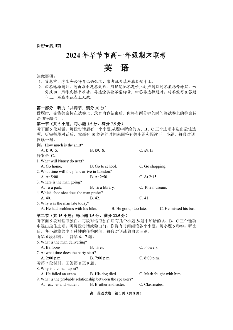 2024年毕节市高一年级期末联考 英语