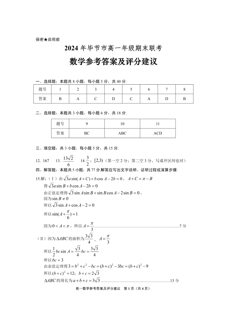 2024年毕节市高一年级期末联考 数学参考答案
