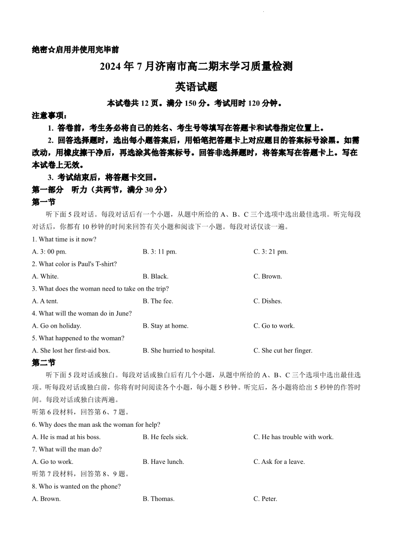 山东省济南市2025届高二下学期期末考试 英语