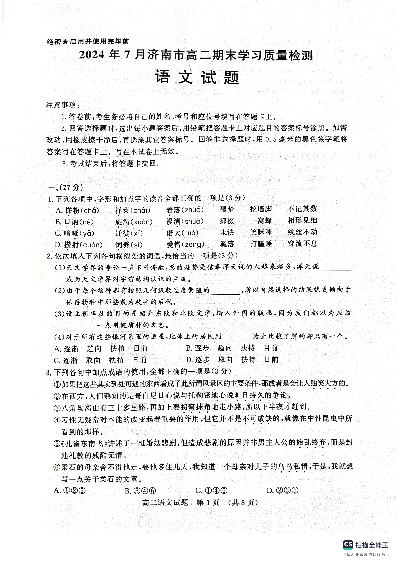 山东省济南市2025届高二下学期期末考试 语文