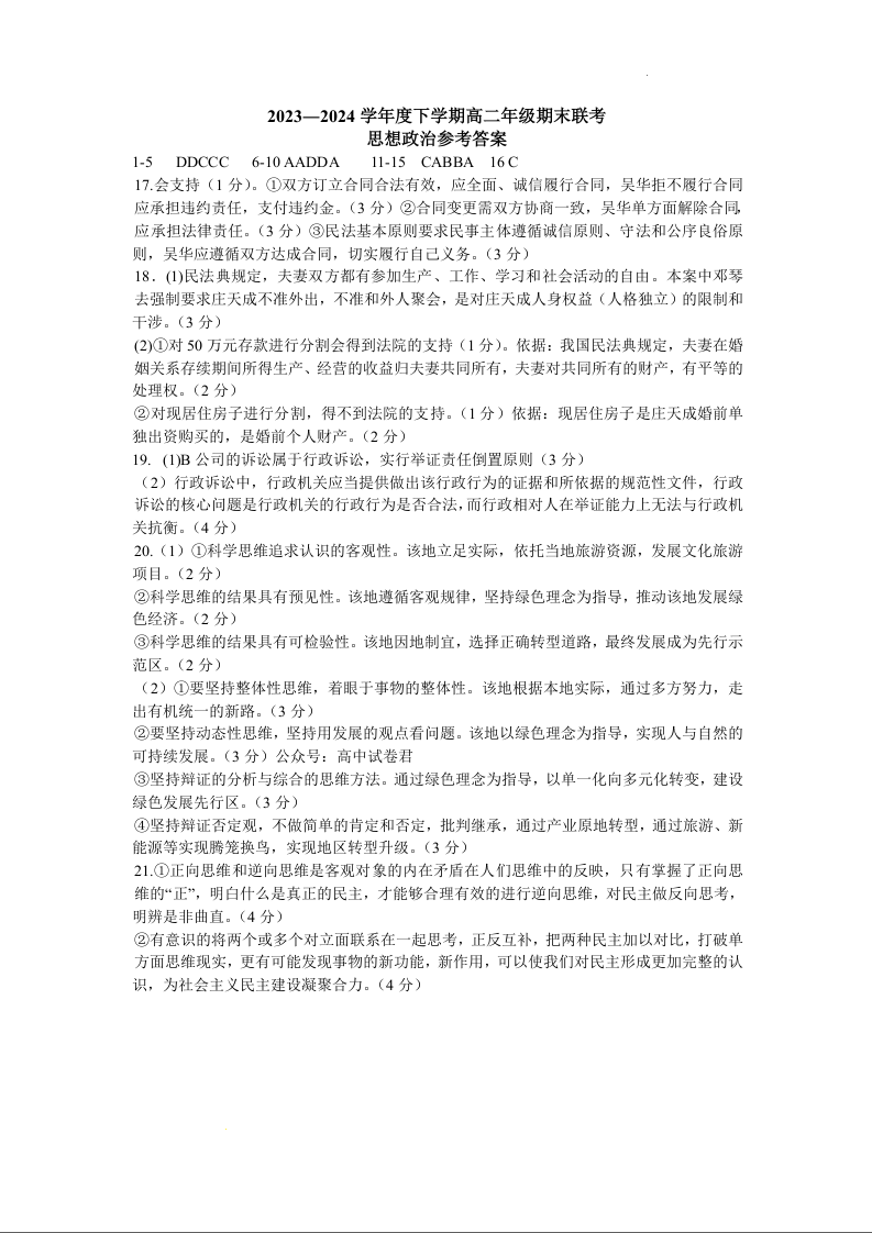 辽宁省点石联考2023-2024学年高二下学期7月期末联考 政治答案