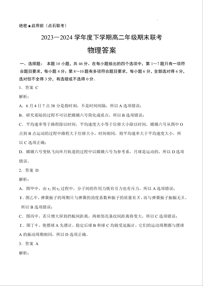 辽宁省点石联考2023-2024学年高二下学期7月期末联考 物理答案