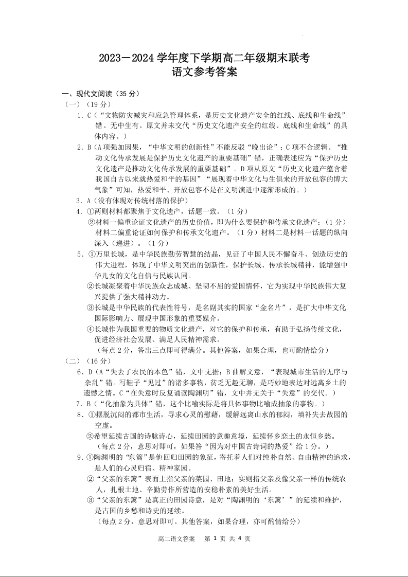 辽宁省点石联考2023-2024学年高二下学期7月期末联考 语文答案