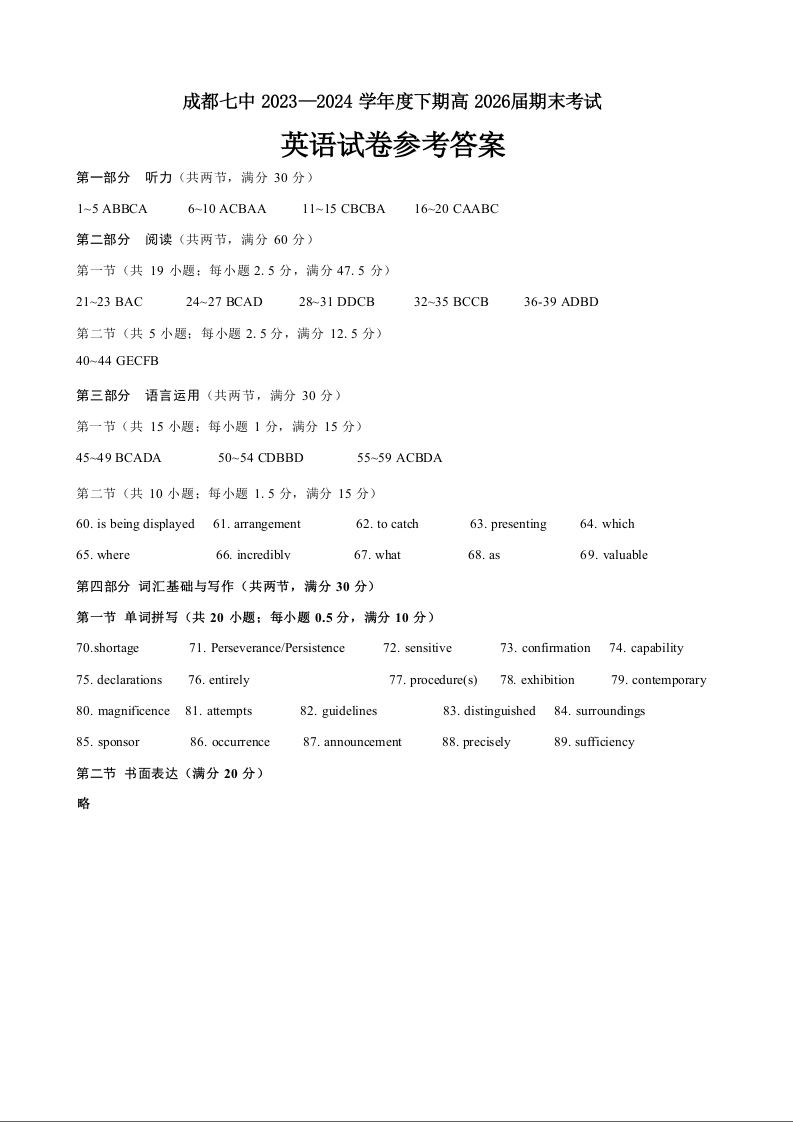 四川省成都市第七中学2023-2024学年高一下学期高2026届期末考试 英语答案
