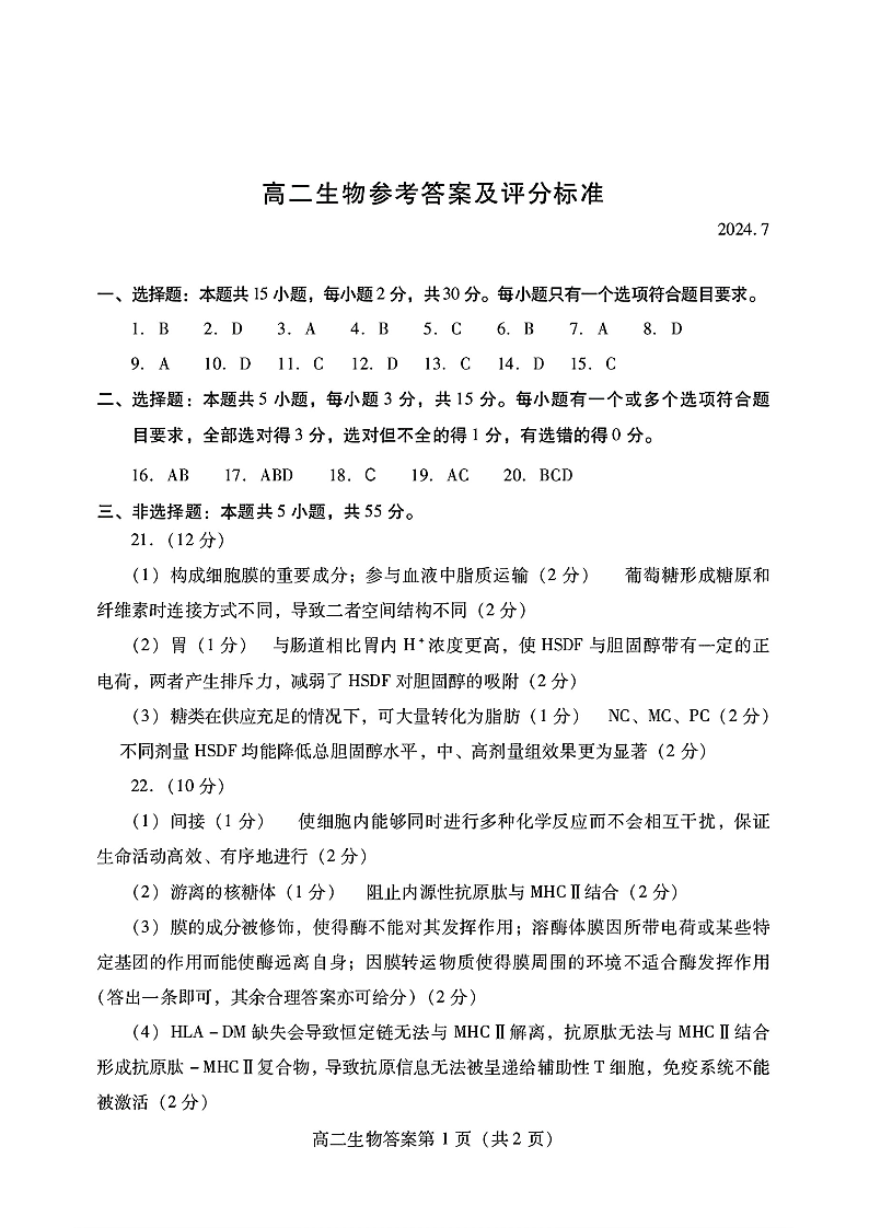 山东省潍坊市2023-2024学年高二下学期期末测试 生物答案