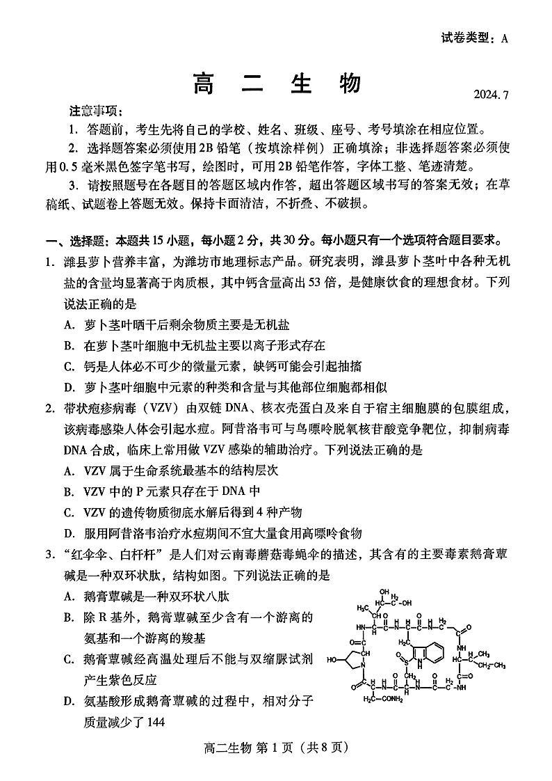 山东省潍坊市2023-2024学年高二下学期期末测试 生物
