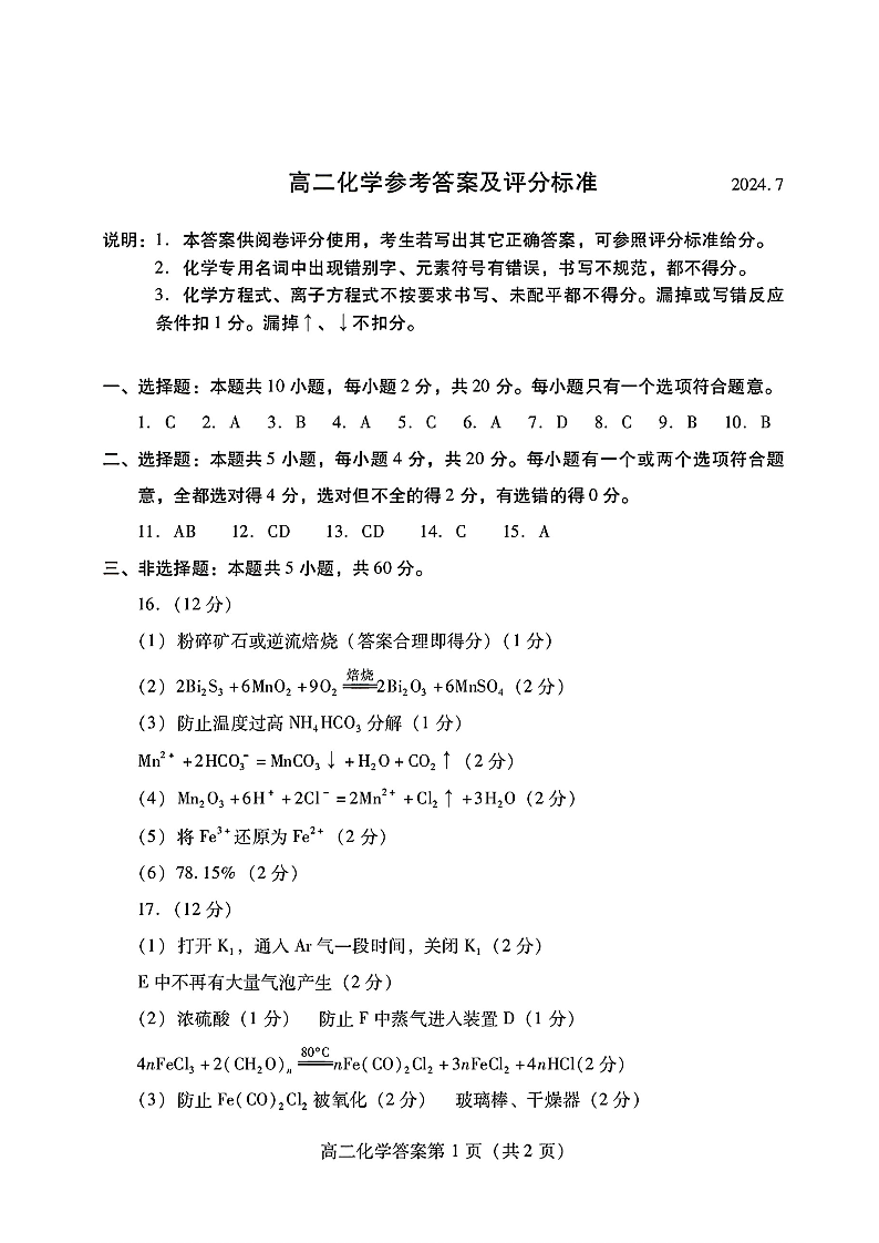 山东省潍坊市2023-2024学年高二下学期期末测试 化学答案