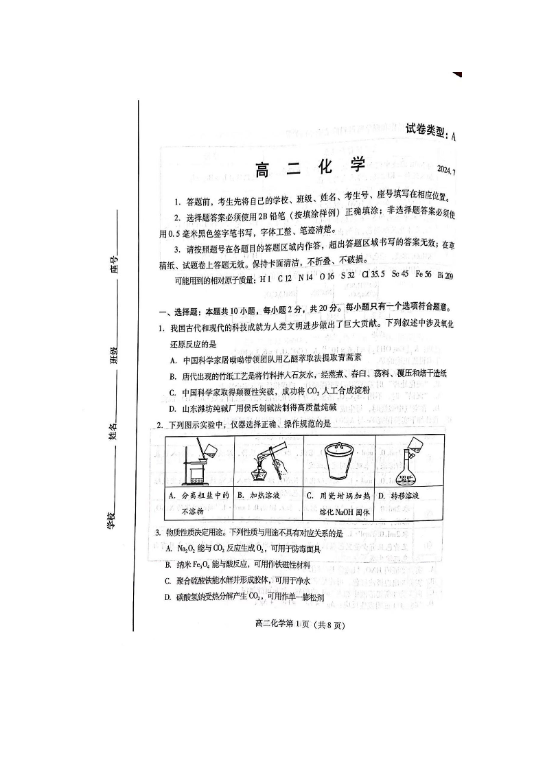 山东省潍坊市2023-2024学年高二下学期期末测试 化学
