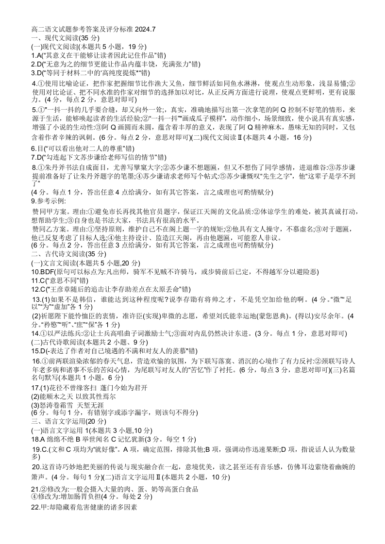 山东省潍坊市2023-2024学年高二下学期期末测试 语文答案