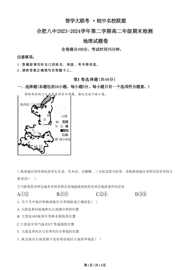安徽省皖中名校联盟(合肥八中等)2023-2024学年第二学期高二年级期末检测 地理