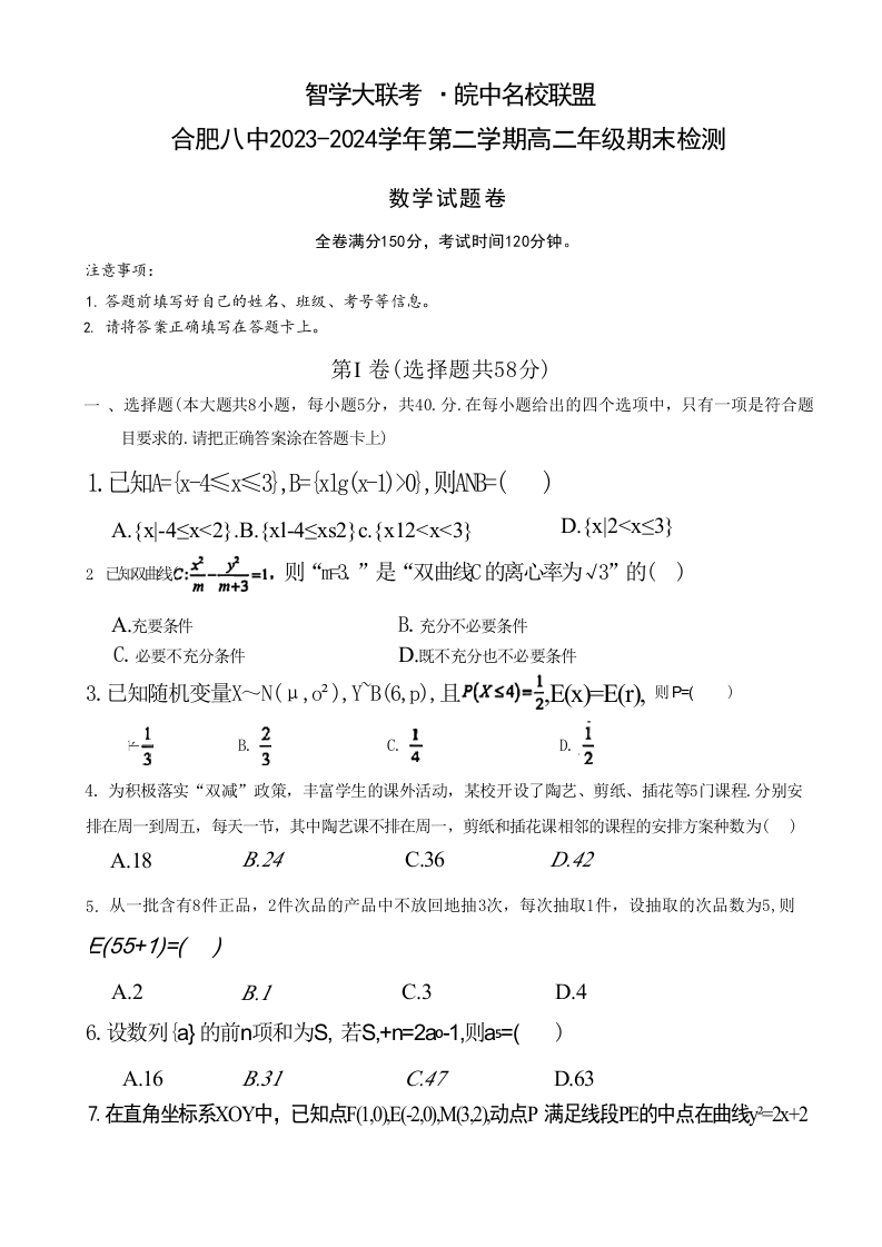 安徽省皖中名校联盟(合肥八中等)2023-2024学年第二学期高二年级期末检测 数学