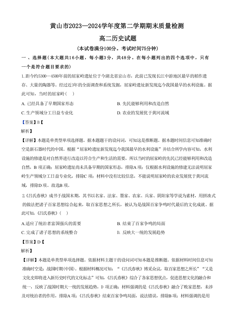 安徽省黄山市2023—2024学年度第二学期期末质量检测 历史