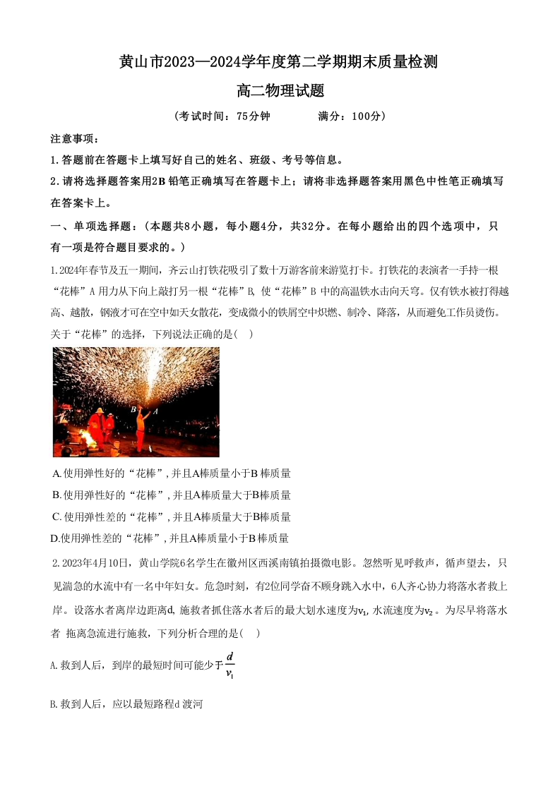 安徽省黄山市2023—2024学年度第二学期期末质量检测 物理