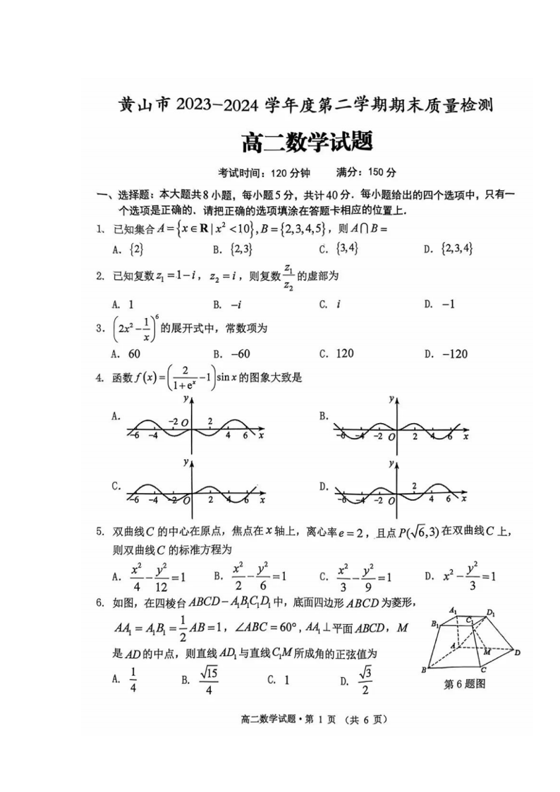 安徽省黄山市2023—2024学年度第二学期期末质量检测 数学