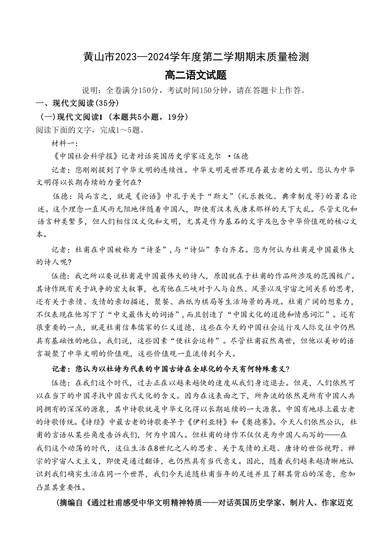 安徽省黄山市2023—2024学年度第二学期期末质量检测 语文