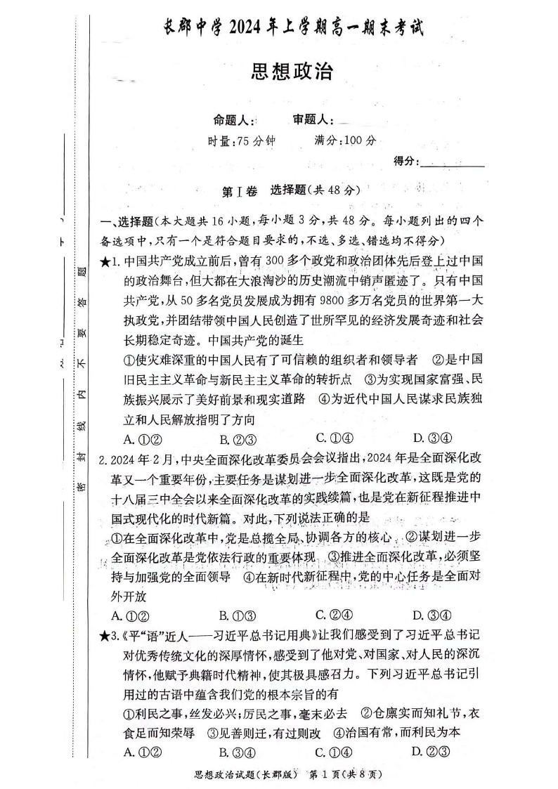 湖南省长沙市长郡中学2024年上学期高一期末考试 政治