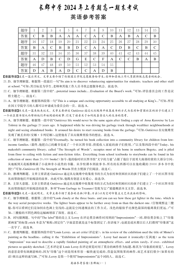 湖南省长沙市长郡中学2024年上学期高一期末考试 英语答案