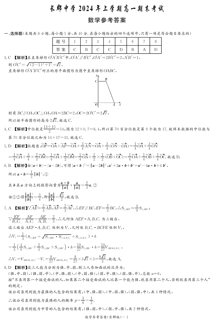 湖南省长沙市长郡中学2024年上学期高一期末考试 数学答案