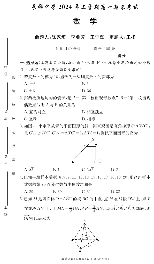 湖南省长沙市长郡中学2024年上学期高一期末考试 数学