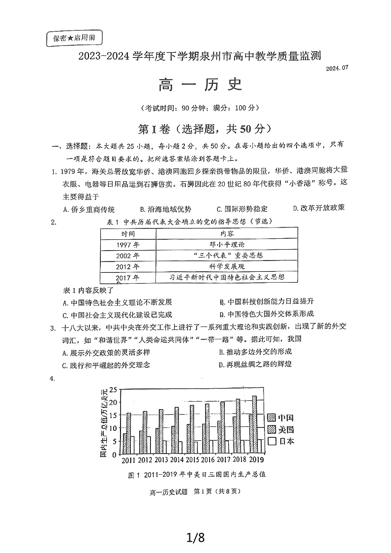 福建省泉州市2023~2024学年高一下学期期末教学质量监测 历史