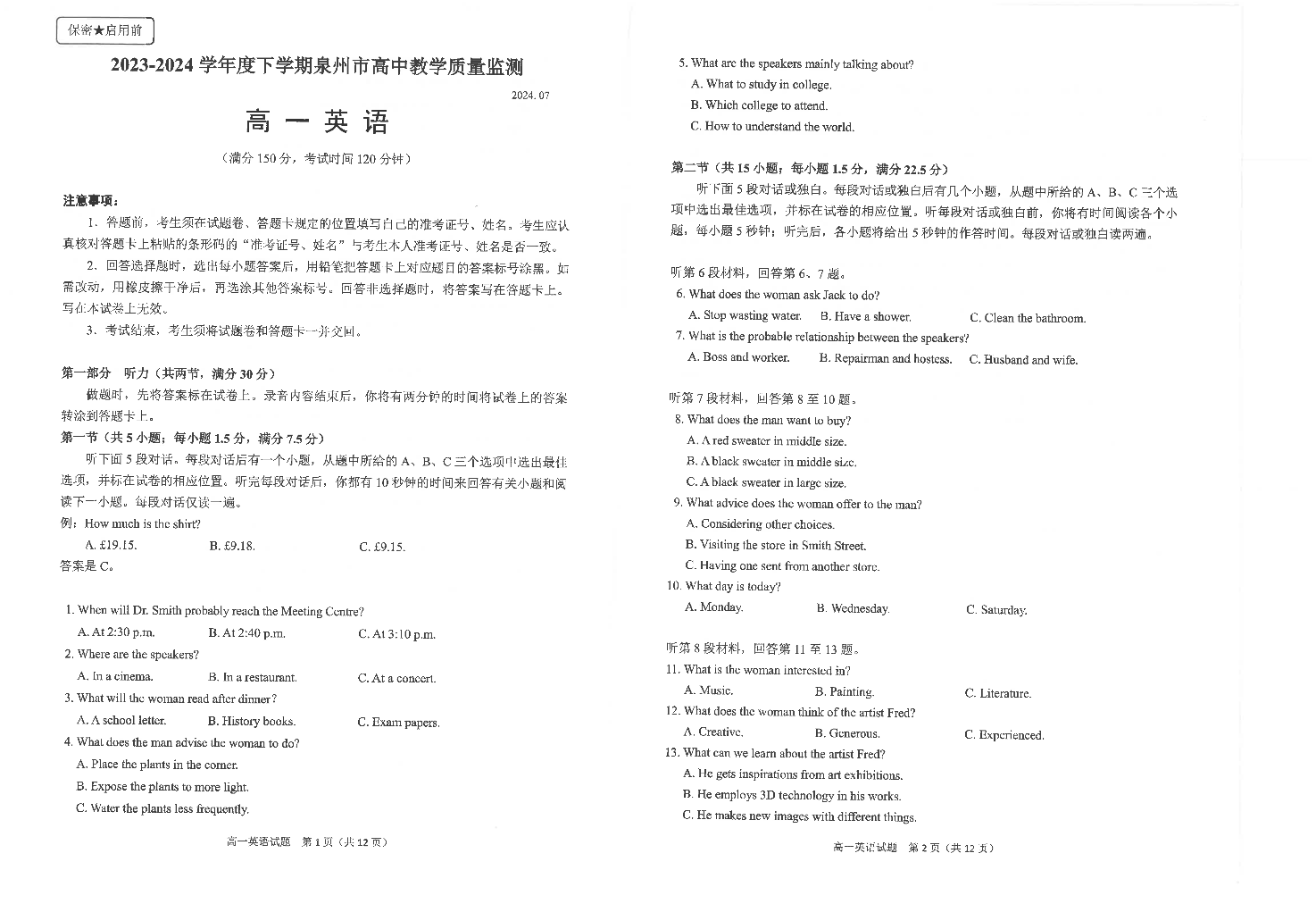 福建省泉州市2023~2024学年高一下学期期末教学质量监测 英语