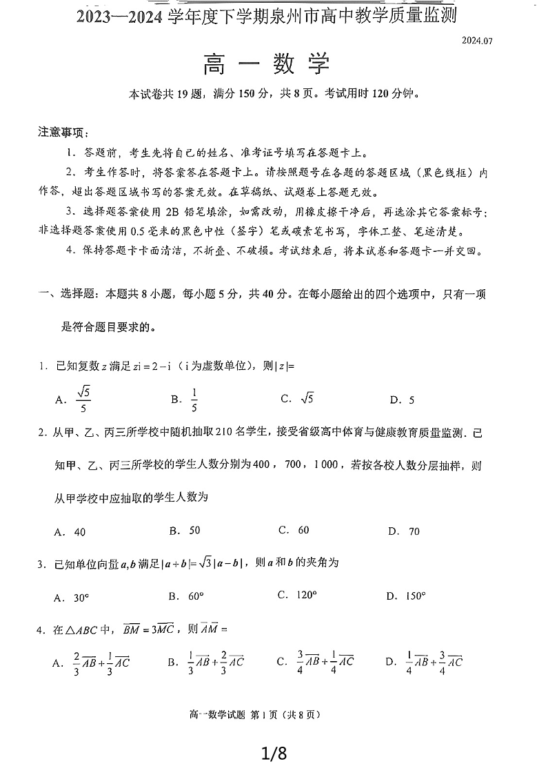 福建省泉州市2023~2024学年高一下学期期末教学质量监测 数学