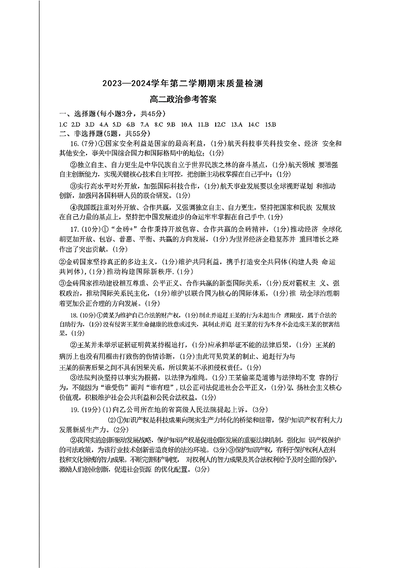 山东省东营市2023-2024学年高二下学期期末质量检测 政治答案