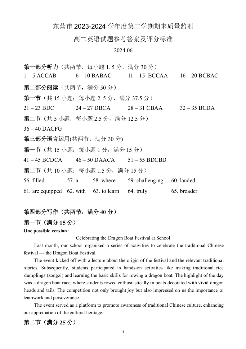 山东省东营市2023-2024学年高二下学期期末质量检测 英语答案