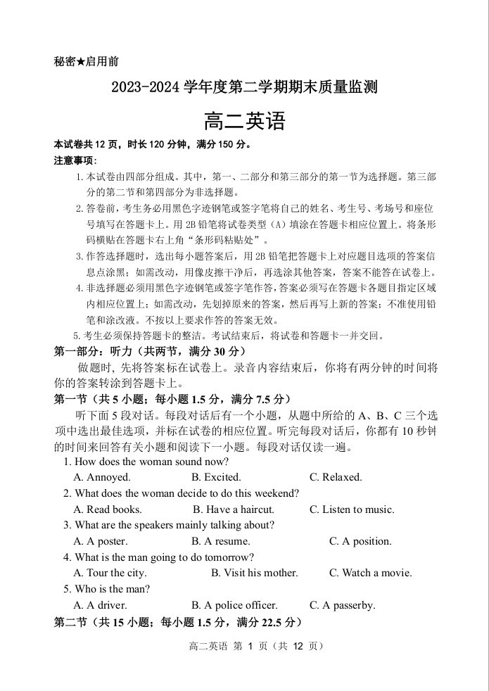 山东省东营市2023-2024学年高二下学期期末质量检测 英语
