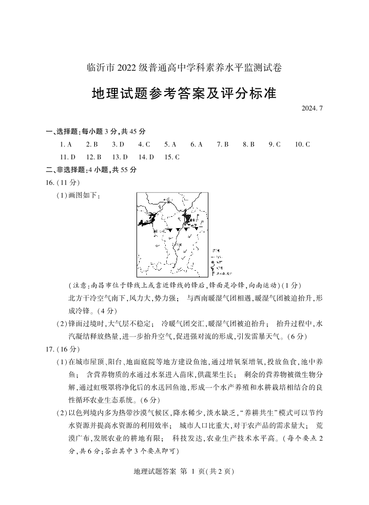 山东省临沂市2023-2024学年高二下学期期末考试 地理答案
