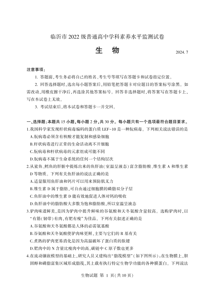 山东省临沂市2023-2024学年高二下学期期末考试 生物